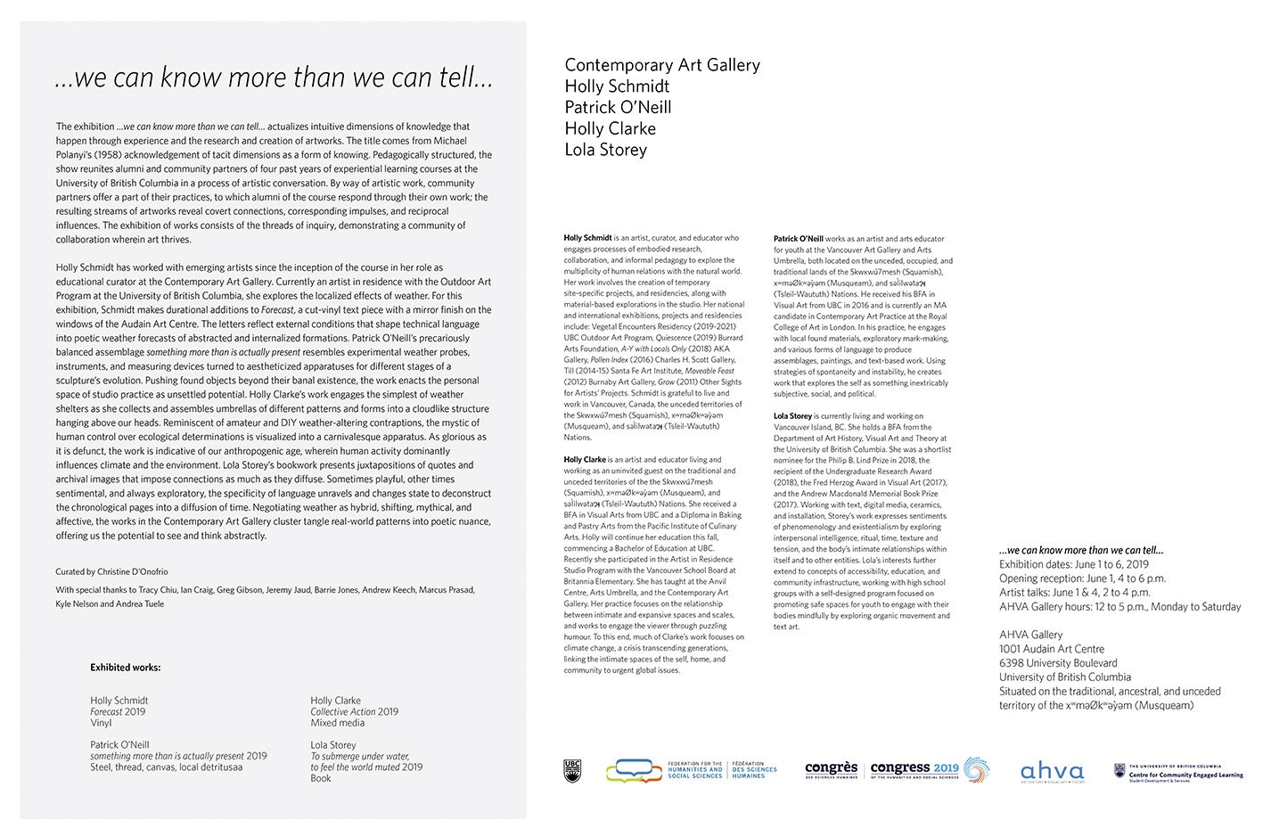 2019 Curator ...we can know more than we can tell... AHVA Gallery, Vancouver BC
