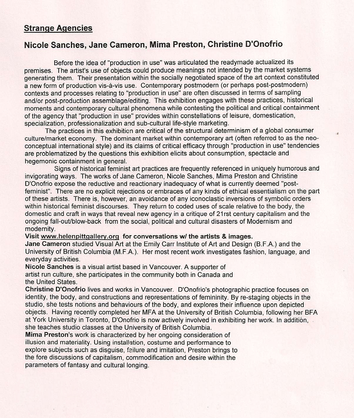 2004 Strange Agencies Helen Pitt GalleryCurated by Jeremy Todd, Vancouver BC